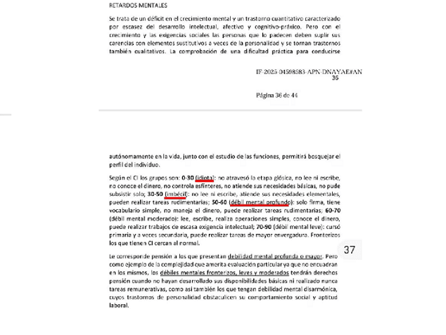 En el documento, la ANDis enfatizó distintos criterios médicos para evaluar los grados de discapacidad intelectual. Utilizó la descripción de “invalidez laboral” y “retardos mentales”. Además, en el anexo de la resolución se emplean palabras como “idiota”, “imbécil” y ”débil mental”.