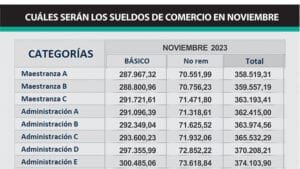 El sueldo de empleados de comercio por categoría correspondientes al mes de noviembre: