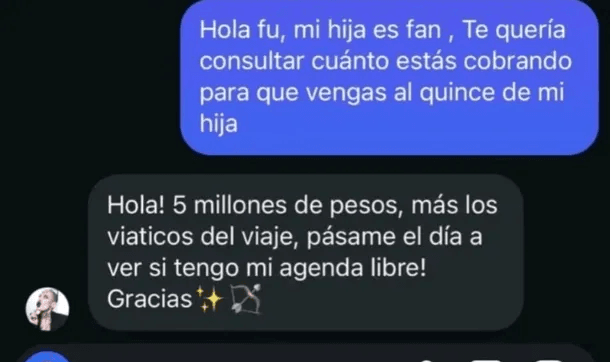 El mensaje que se difundió a través de redes sociales inició con un pedido de la mujer que se encargó de impulsar la viralización: “Hola Fu, mi hija es fan, te quería consultar cuánto estás cobrando para que vengas al quince de mi hija”, preguntó, sin esperar la tremenda respuesta que obtendría.