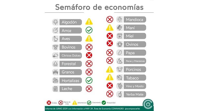 Según se desprende del análisis, hay 12 economías regionales en rojo, es decir, en crisis o signos de crisis (mandioca, miel, ovinos, papas, peras y manzanas, vino, yerba, leche, granos, forestas y cítricos), mientras que solo cinco están en amarillo, lo que significa con advertencias, y eso es por los cambios de tendencia de precios (algodón, maní, aves, porcino y tabaco).