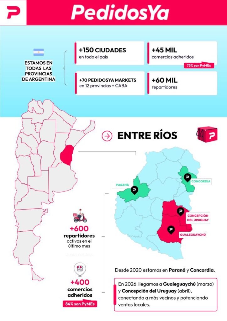 Con presencia en más de 150 ciudades de todas las provincias del país, PedidosYa busca replicar en las localidades entrerrianas un modelo que combina tecnología con las necesidades de cada comunidad, facilitando el acceso a diversas categorías clave. En Gualeguaychú, PedidosYa prevé cerrar el año con una oferta de más de 100 comercios, en un primer término, enfocada en restaurantes, a la que luego agregará supermercados, farmacias y tiendas de mascotas, y más de 7000 órdenes mensuales; en tanto, en Concepción del Uruguay espera más de 80 comercios y 5000 pedidos al mes.