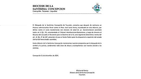 Este miércoles, el Obispado de la Santísima Concepción de Tucumán informó la expulsión del estado clerical de José Justo Ilarraz. Esto se debe al proceso administrativo penal contra el sacerdote, incardinado en esta diócesis.