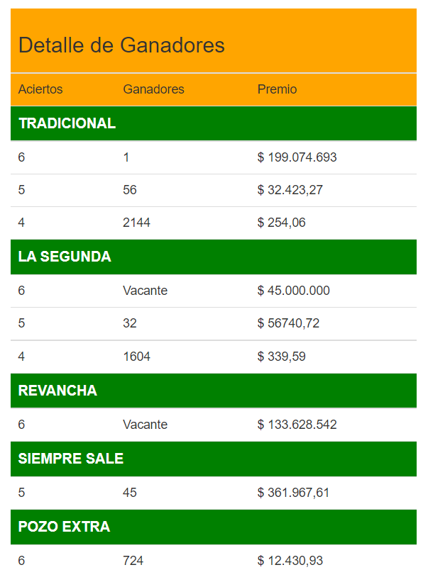 En el Tradicional salieron el 16-05-30-27-04-15. Un ganador, oriundo de Bahía Blanca, provincia de Buenos Aires, acertó todos los números y se lleva $199.074.693,89.