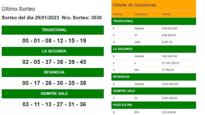 En el Tradicional salieron el 19-15-01-08-12-00. Ningún apostador acertó todos los números y el pozo quedó vacante. Acumula para el próximo sorteo $80.000.000.