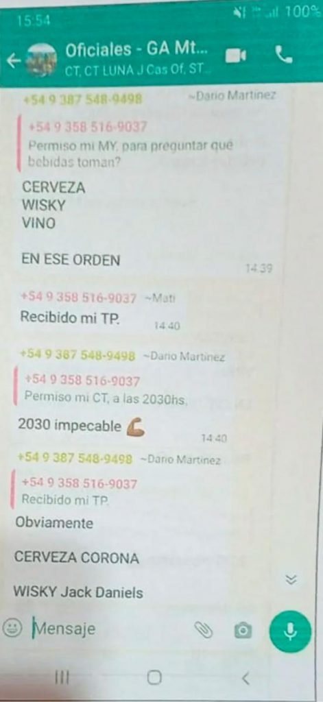 Instantáneamente, uno de sus superiores le respondió: “Cerveza, whisky, vino. En ese orden.Obviamente cerveza Corona, Whisky Jack Daniels”. Asimismo, Ezequiel Meza, uno de los principales acusados, agregó otro encargo: “No se olviden de los puchos”.