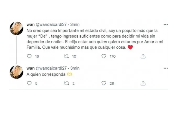 “No creo que sea importante mi estado civil, soy un poquito más que la mujer ‘De’, tengo ingresos suficientes como para decidir mi vida sin depender de nadie. Si elijo estar con quien quiero estar es por Amor a mi Familia. Que vale muchísimo más que cualquier cosa”, (SIC) escribió Wanda y cerró la publicación con un corazón.